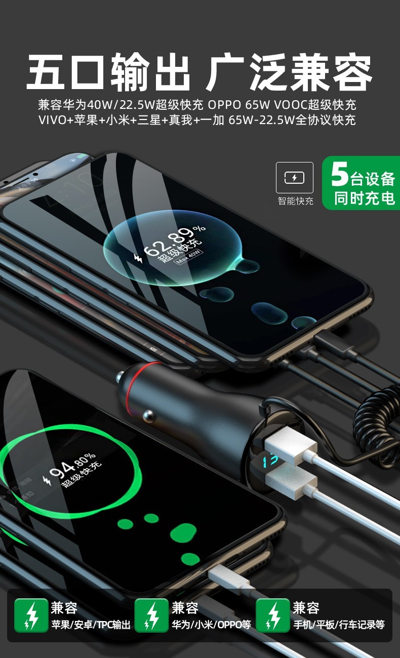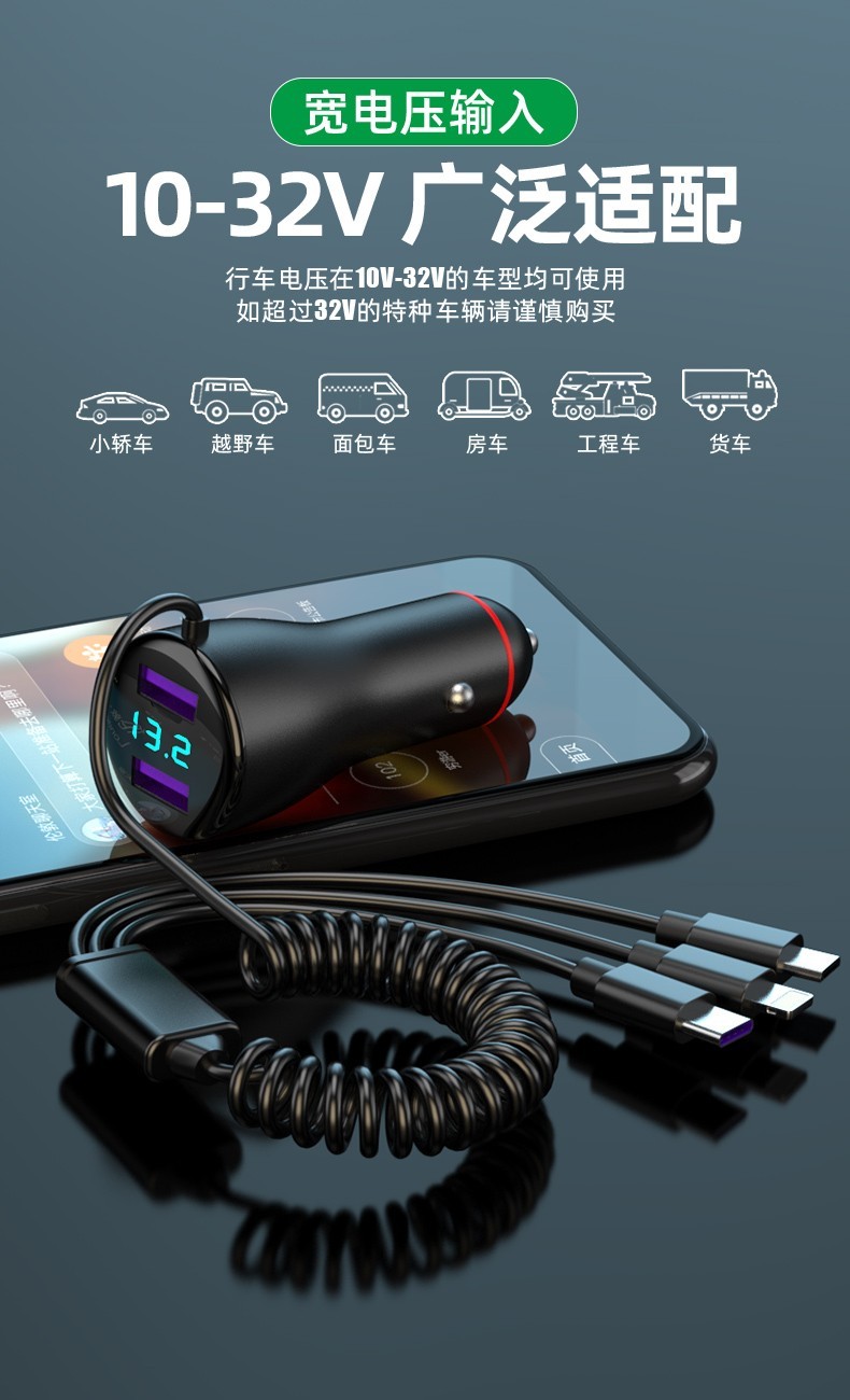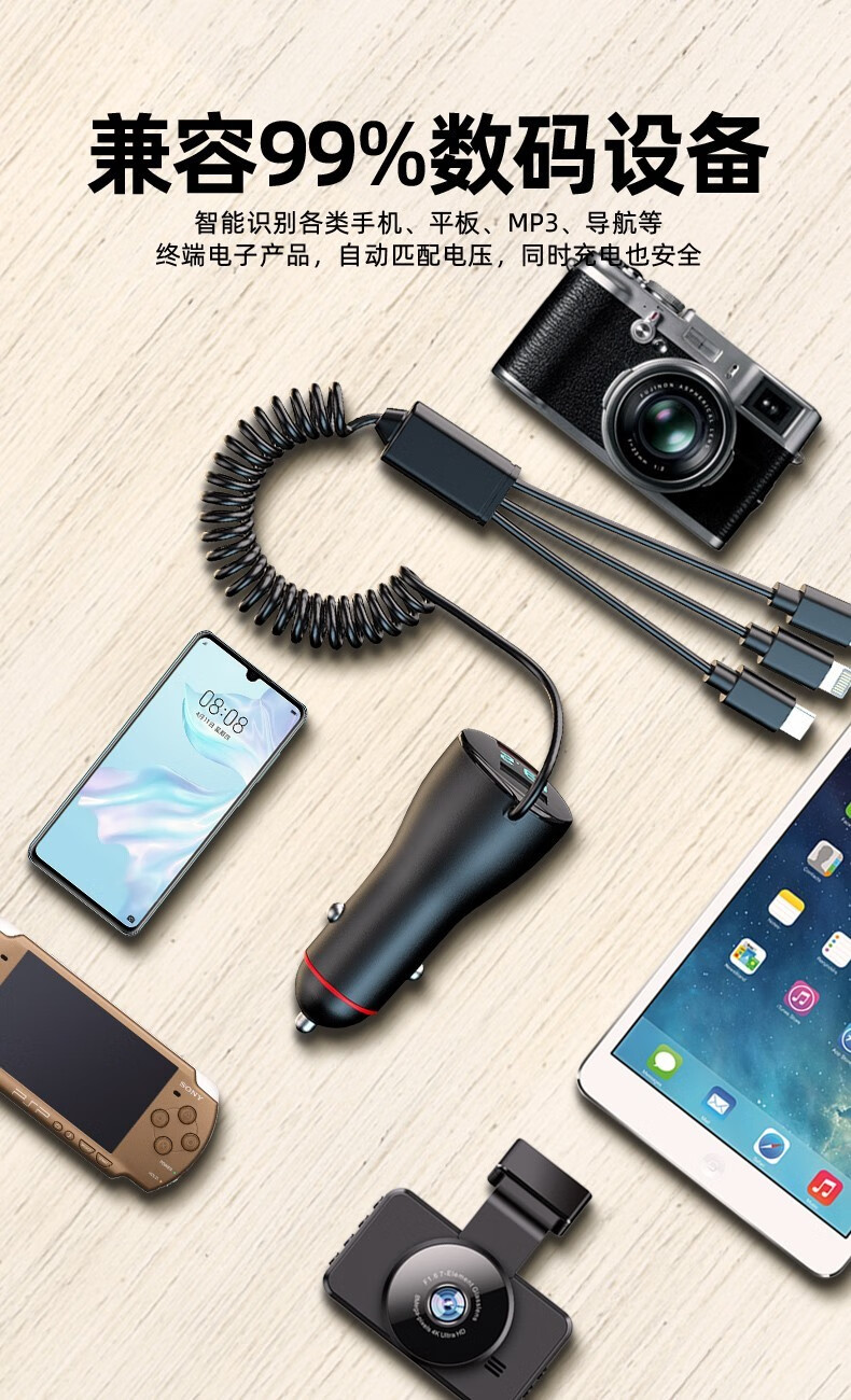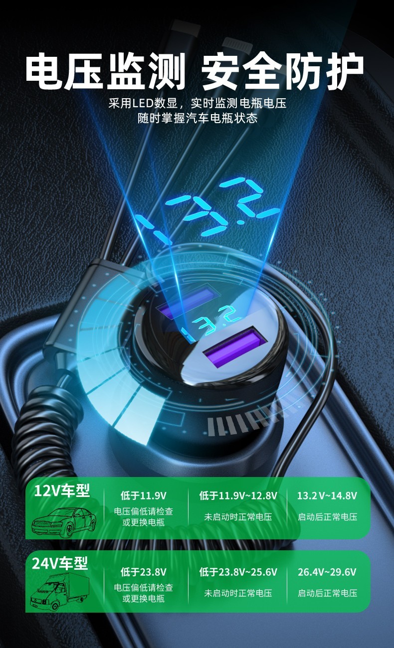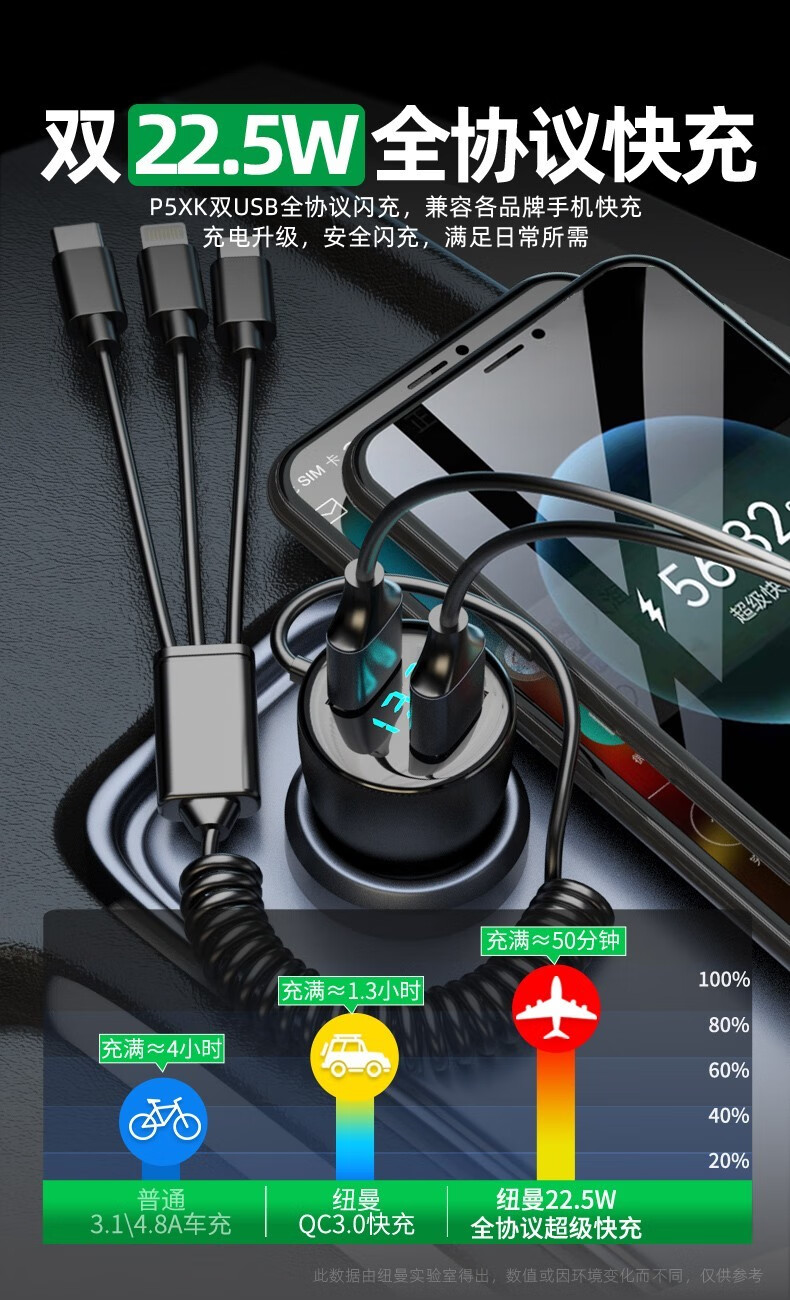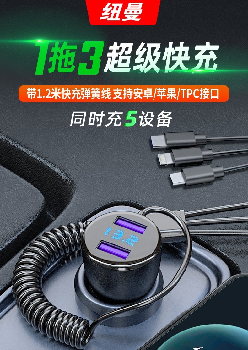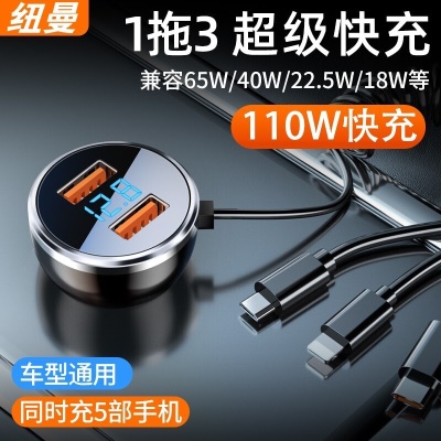纽曼车载充电器 110W快充电压显示12V24V一拖三快充线扩展点烟器孔转换插头车载充电器快充头